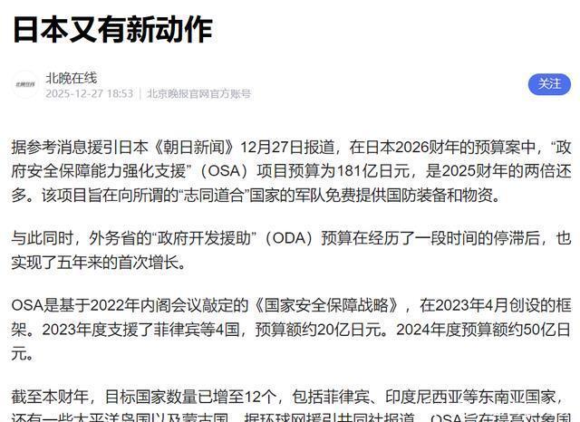 事情的爆点,出现在今年年底。 日本《朝日新闻》12月27日披露,在2026财年预算草案中,日本对外军事援助计划。 政府安全保障能力强化支援(OSA)项目, 预算暴涨至181亿日元 是前一年预算的 两倍还多 。 且不说这个涨幅是狂拉式的,就金额而言也够扎眼。 这些钱将用于一件事, 向所谓志同道合国家的军队,免费提供日本制造的武器装备和物资 。 不是贷款,不是优惠价格,而是日本政府直接掏钱,把武器装备送给指定国家。 而这些国家怎么选?一看名单就懂了,日本的目标国不是非洲、南美,而是 菲律宾、印尼、蒙古以及多个太平洋岛国 。 就是中国周边这片战略重地全包进去了。
