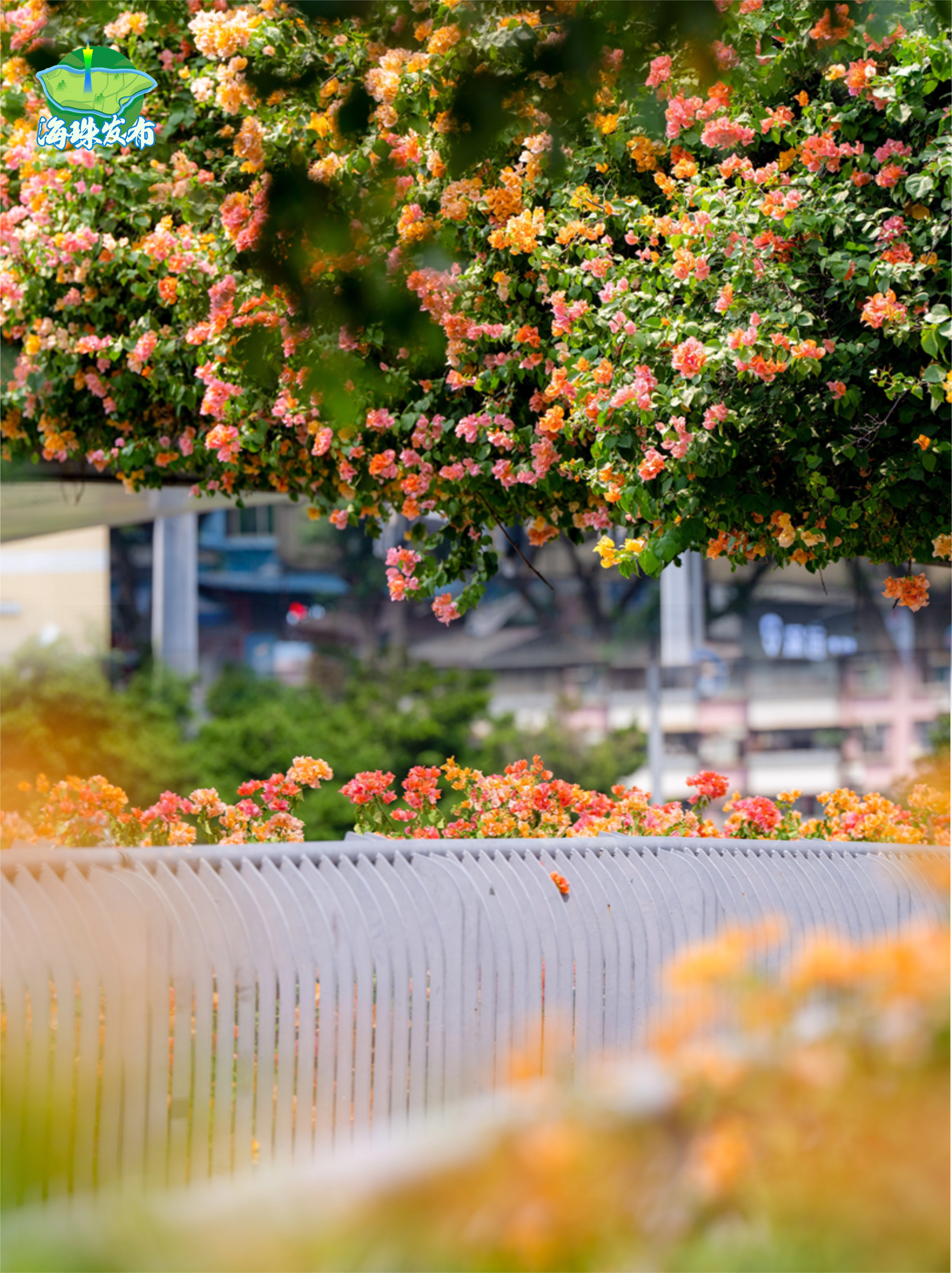 利用栏杆曲线构图,拍出花带蜿蜒的纵深感